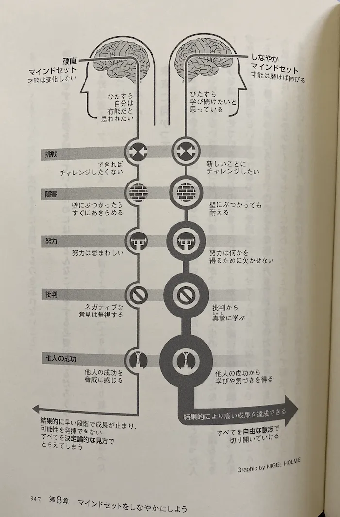 この本は「硬直マインドセット」と「しなやかマインドセット」を持つ人を比較しながら、いかに「しなやかマインドセット」をもつことが大切かを説明した内容となっています。