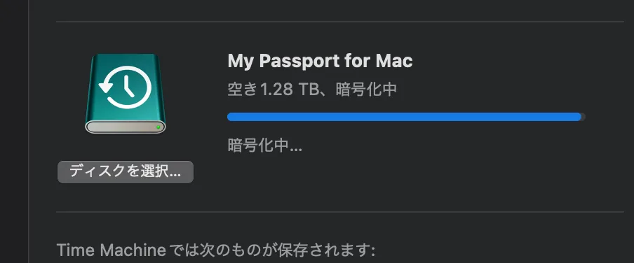 その状態から、新しく購入した M1 の MacBook Pro 14 インチ のバックアップを開始し、そのときに暗号化を開始しました。