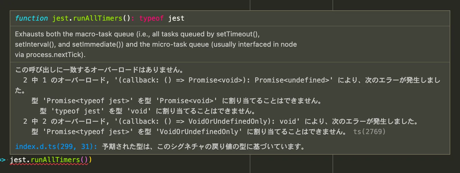 しかしこれは型エラーになってしまいます。なぜなら、jest.runAllTimers() は値を返すため、前述した act の型定義と一致しないからです。
