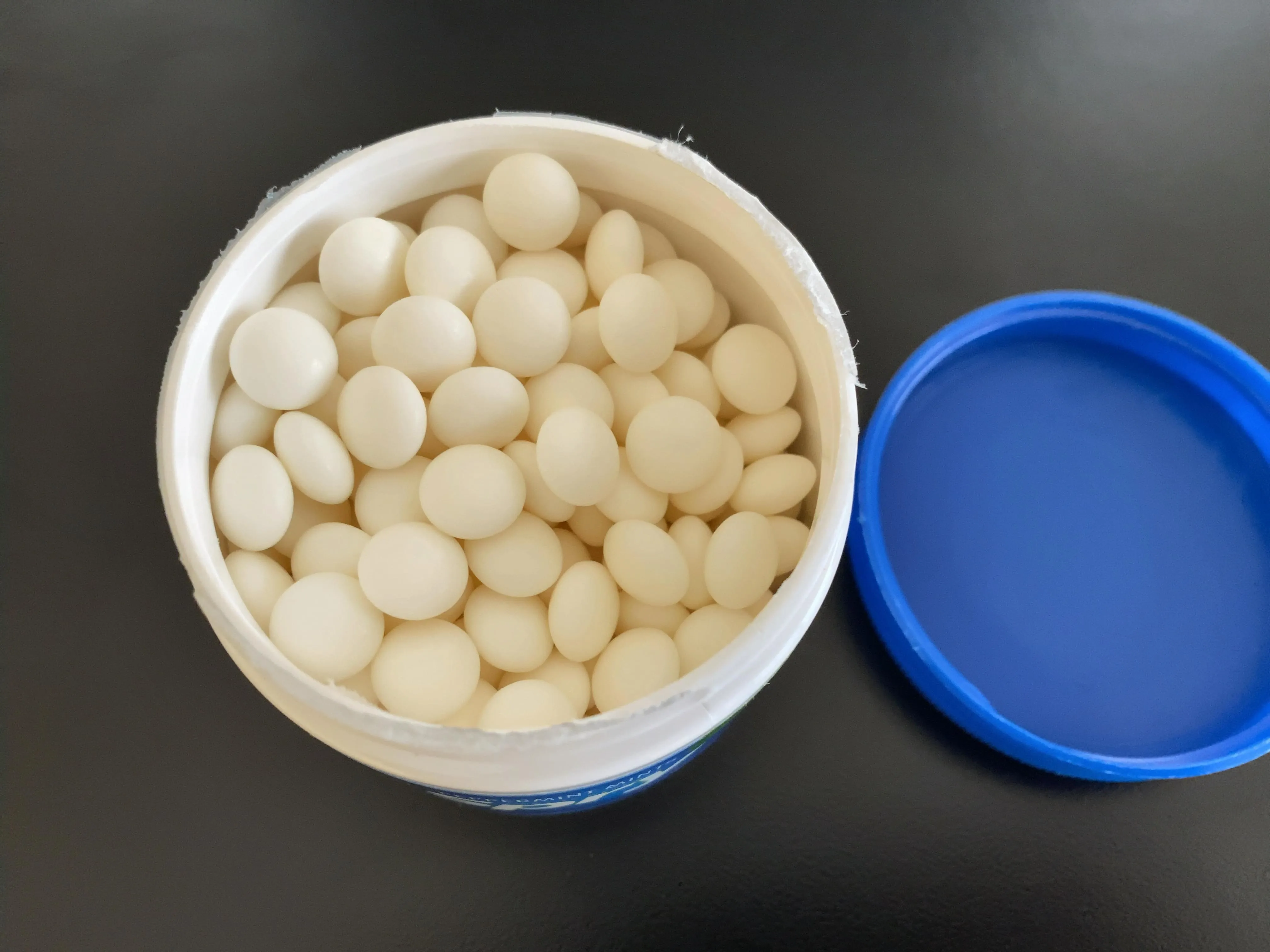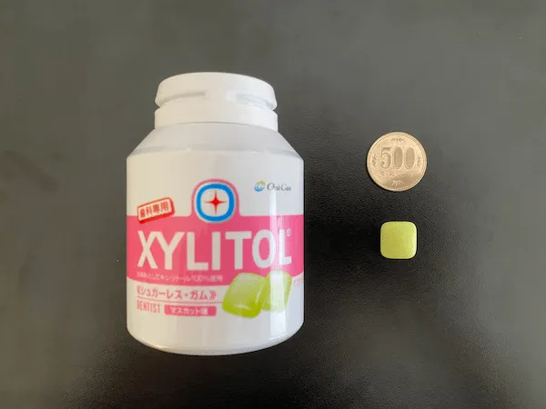 ミント系のタブレットで、味はミンティアなどに近い感じです。1 粒に 0.5g のキシリトールが含まれており、100%キシリトールなため普通にお菓子を食べるよりは、こちらを食べたほうが歯に良いでしょう。